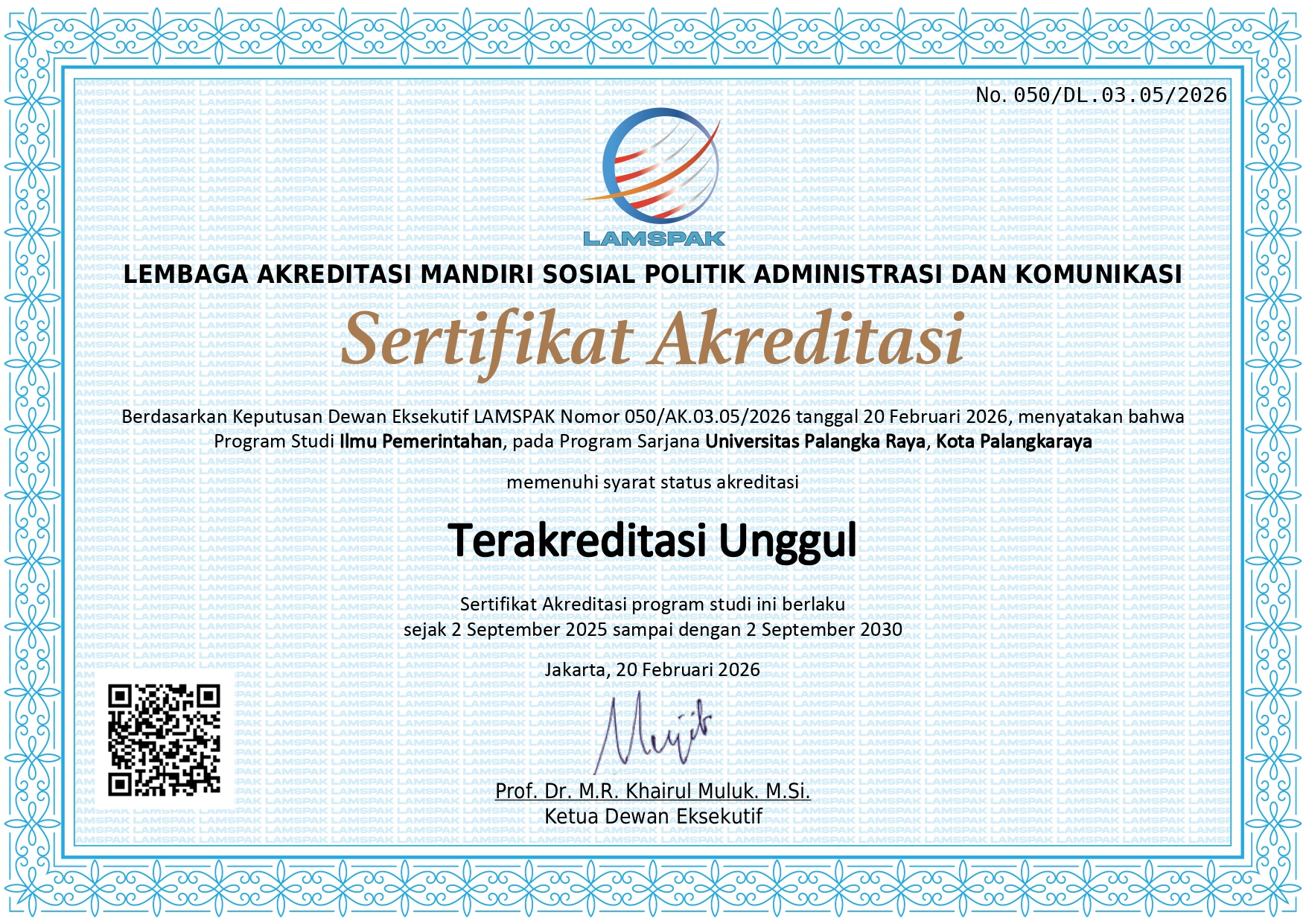 Akreditasi Unggul diperoleh berdasarkan Keputusan Dewan Eksekutif LAMSPAK Nomor 050/AK.03.05/2026 tanggal 20 Februari 2026, menyatakan bahwa Program Studi Ilmu Pemerintahan, pada Program Sarjana Universitas Palangka Raya, Kota Palangkaraya memenuhi syarat status akreditasi “Terakreditasi Unggul”.